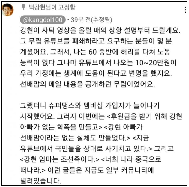 백강현을 후원한 분들은 그 후원금을 딴 곳에 사용한다고 하는 내용의 유튜브가 올라왔었는데
